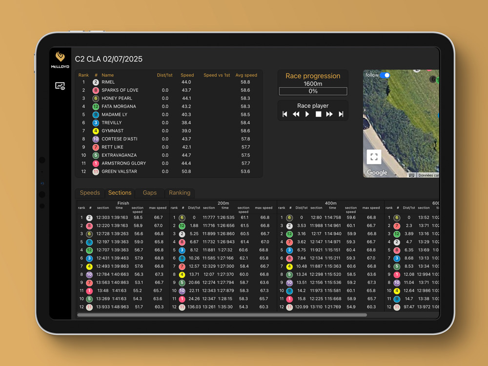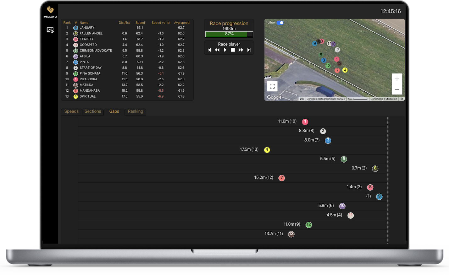 Grâce à notre transmission de données 10Hz et à notre précision GPS, vous connaissez exactement l’écart entre tous les chevaux à n’importe quel point clé de la course !