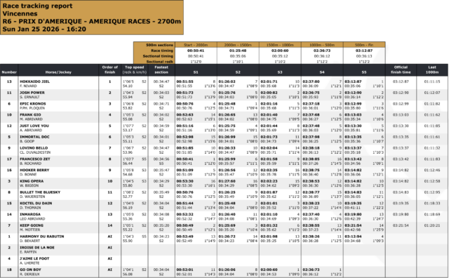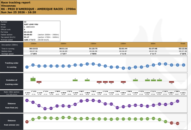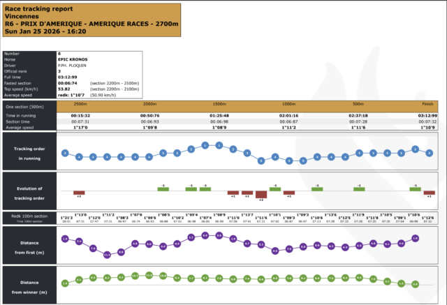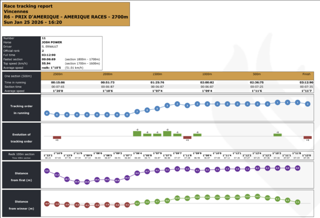 Dans un Prix dâAmĂ©rique 2026 trĂšs tactique, disputĂ© sur un rythme soutenu mais sans emballement prĂ©maturĂ©, Hokkaido Jiel a fait la diffĂ©rence grĂące Ă un parcours dâĂ©conomie parfaitement maĂźtrisĂ©. Longtemps maintenu au cĆur du peloton, Franck Nivard a su profiter du bon wagon et dâun passage dĂ©cisif dans la ligne droite pour ajuster Josh Power, animateur courageux mais battu sur le fil. Epic Kronos, toujours bien placĂ©, complĂšte un podium logique au terme dâune course oĂč le placement et la gestion de lâeffort ont primĂ© sur la vitesse pure, comme lâillustrent les donnĂ©es de tracking.