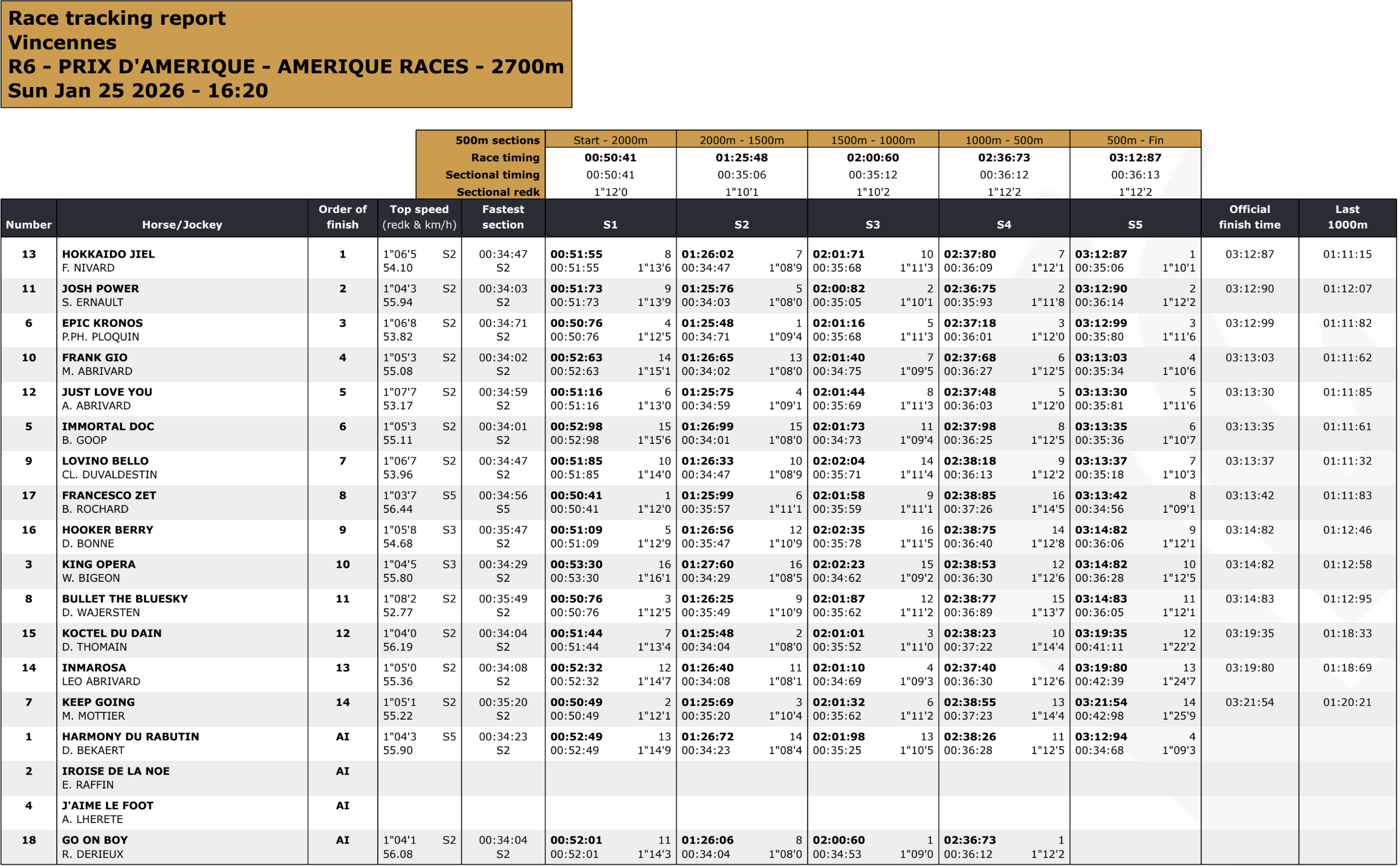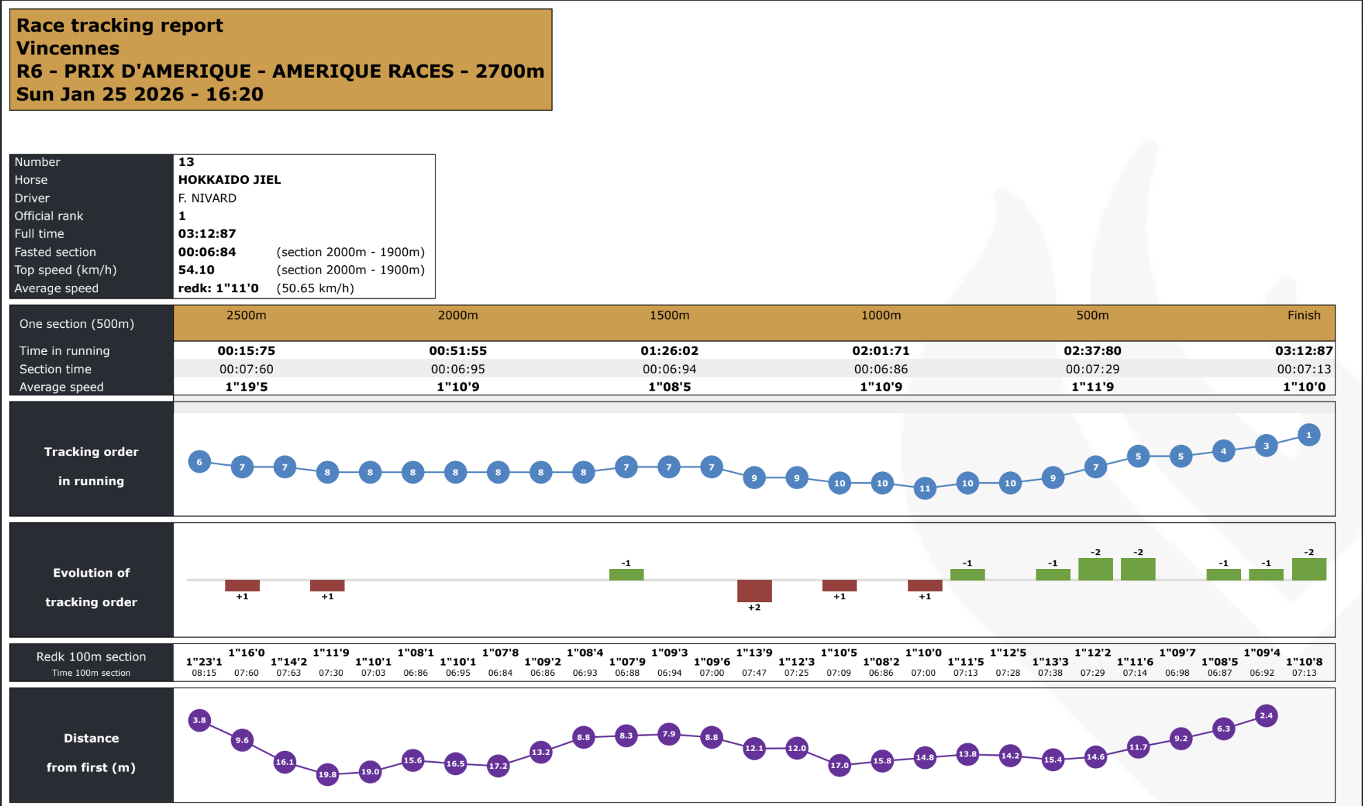 đ Longtemps maintenu au cĆur du peloton (jusquâĂ 20 m du leader), Hokkaido Jiel bĂ©nĂ©ficie dâun parcours dâĂ©conomie totale. Son accĂ©lĂ©ration est mesurĂ©e mais constante, avec une remontĂ©e progressive Ă partir des 800 derniers mĂštres. Il signe la meilleure section intermĂ©diaire de la course et termine en force, profitant dâun passage idĂ©al Ă la corde.