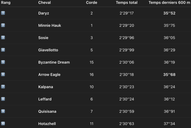 Among the brave losers, Byzantine Dream (stall 15) and Arrow Eagle (stall 16) delivered remarkable sectionals despite their poor draws.